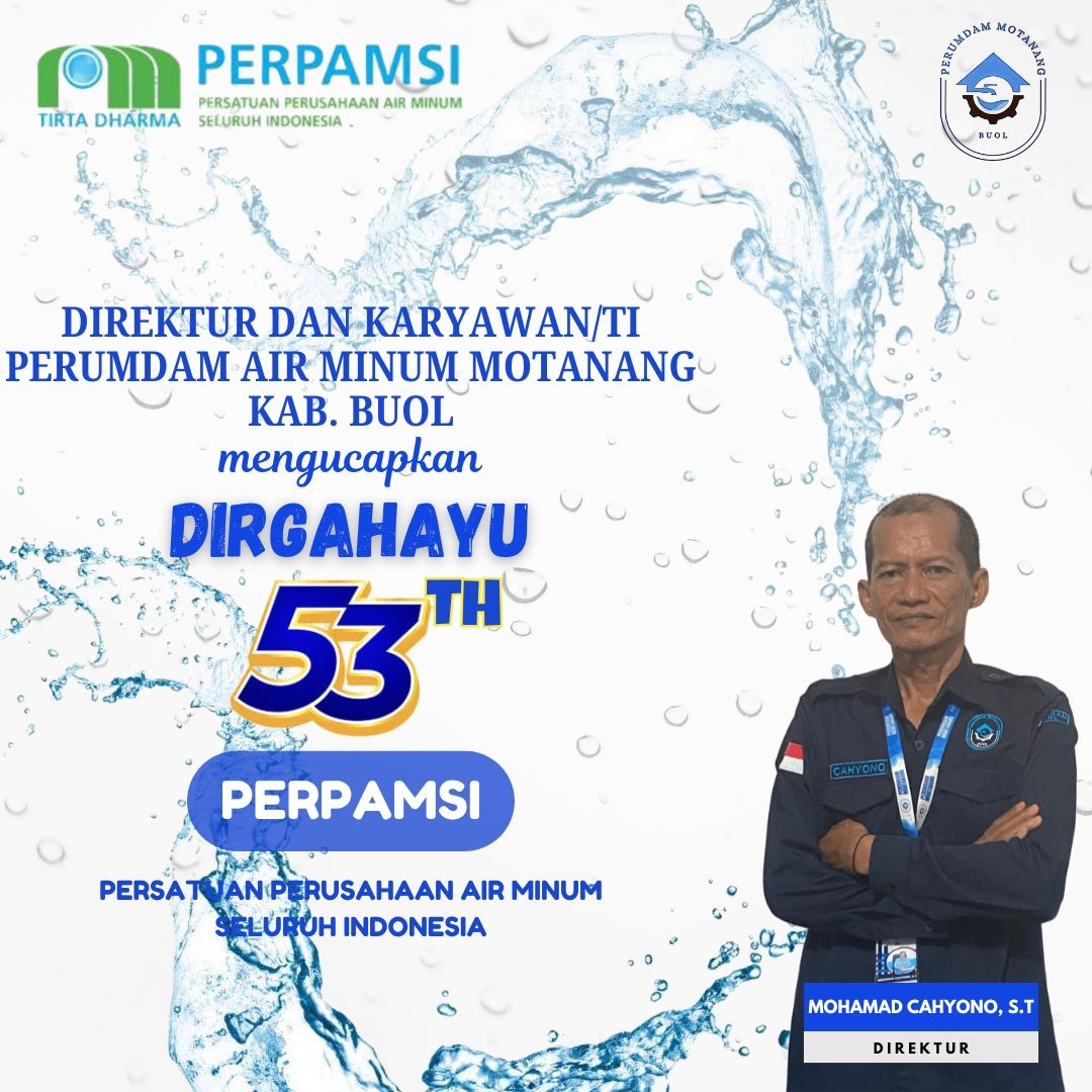 Selamat ulang tahun yang ke-53 tahun. Semoga Persatuan Perusahaan Air Minum Seluruh Indonesia terus berkembang dan berperan aktif dalam meningkatkan kualitas dan aksesibilitas air bersih di seluruh penjuru tanah air. Dengan semangat kebersamaan, kami berharap setiap langkah yang diambil dapat